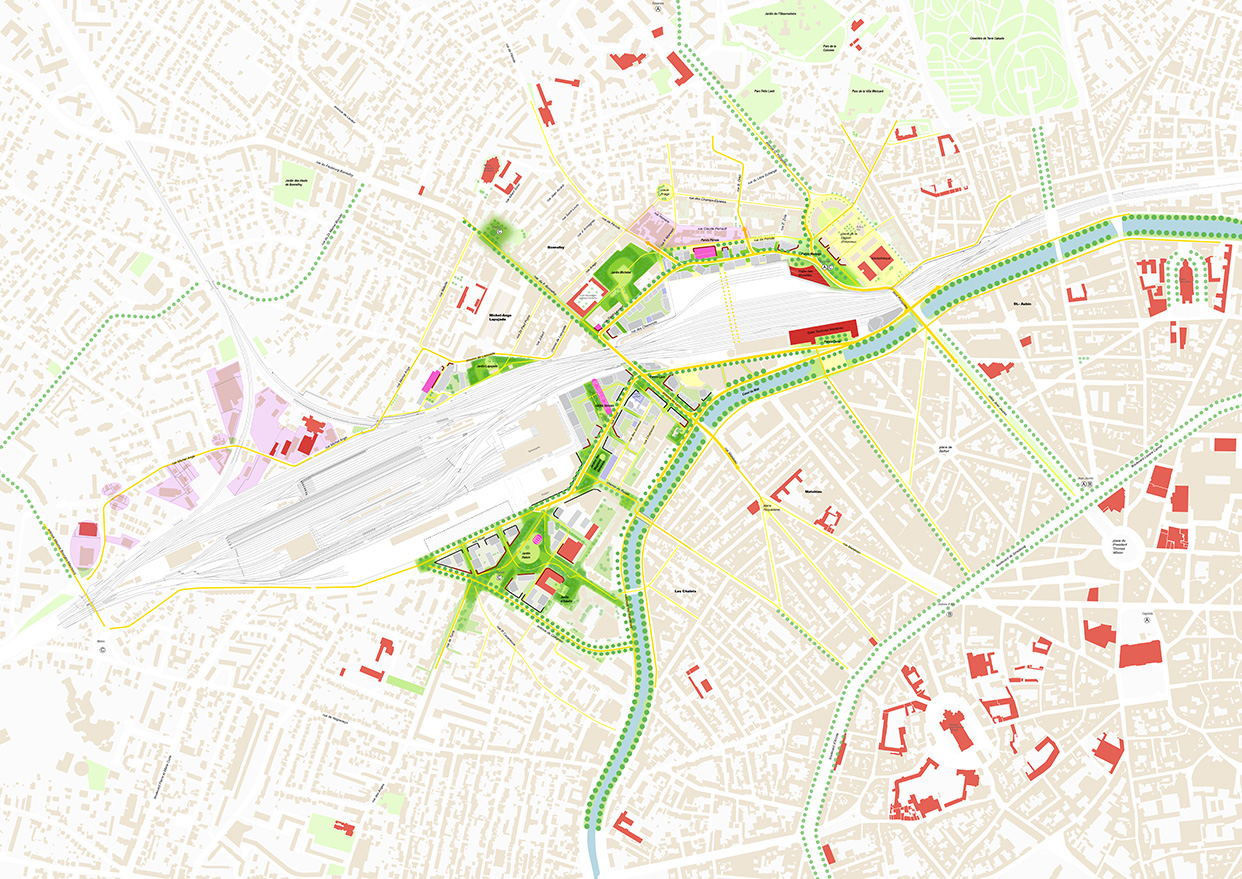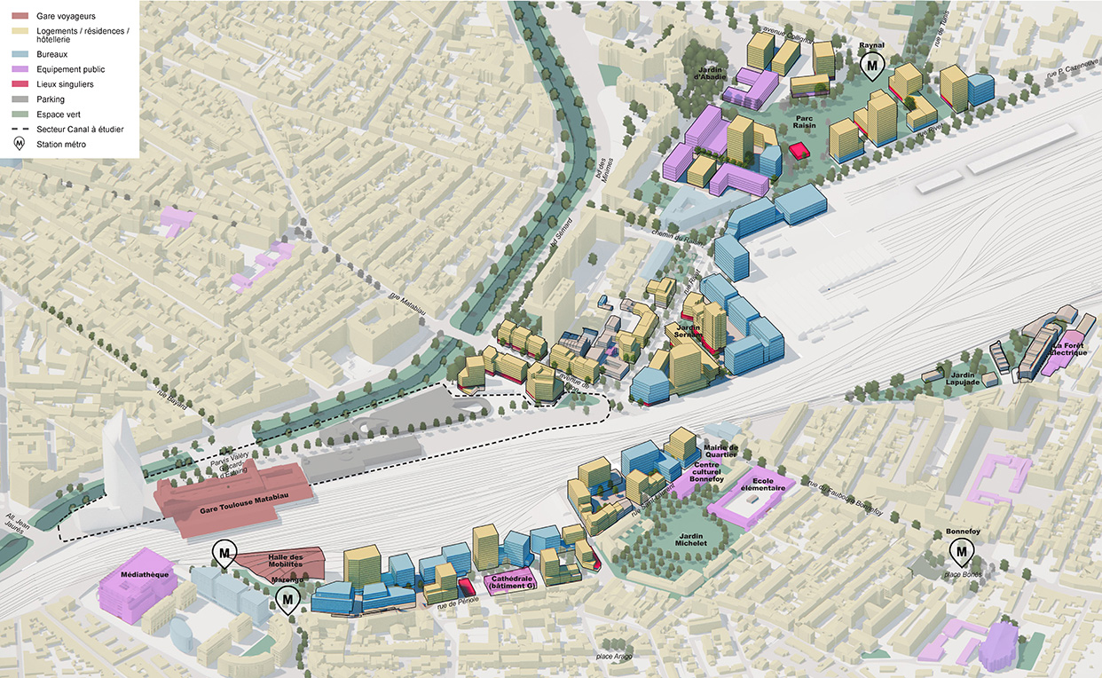 quartier dans la réalité physique et sociale du territoire pour donner une âme spécifique au Grand Matabiau, en évitant ainsi l’écueil du « quartier gare » sans âme et standardisé. La démarche s’inspire également de la volonté politique affirmée d’augmenter la présence de la nature en ville, contribuant au confort de vie et d’usage des futurs quartiers et de leurs habitants.