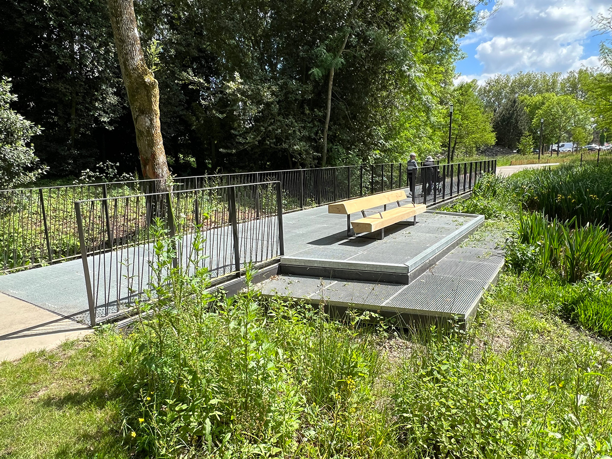 La gestion différenciée des prairies humides et l’ouverture des berges par un chemin de fauche conforte le caractère naturel du site du moulin du chêne. Quelques ouvrages ponctuent les 450m linéaires de berge : une terrasse, une passerelle, un belvédère et un franchissement. Autant de séquences qui animent le parcours entre la promenade haute (prairie du moulin du chêne) et la promenade basse de la carrière et qui révèle la chaussée des moines.